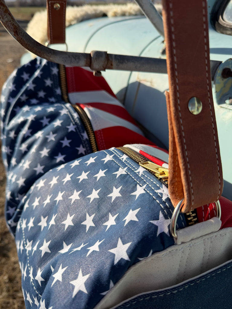 Meet the Freedom Flyer, a one-of-a-kind cowboy carpet gear bag crafted for those who carry the spirit of America wherever they roam. This striking bag features bold patriotic patterning and is fully lined with our heavy-duty canvas—built to withstand ranch life, road trips, and the daily grit of hard work.