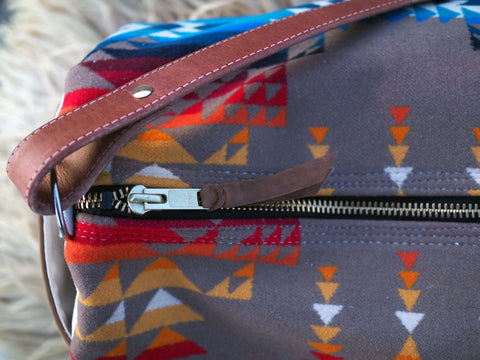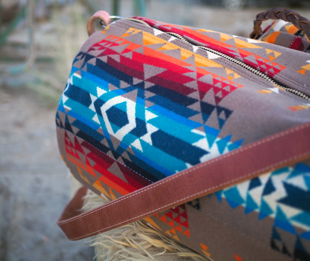 Wrapped in authentic Pendleton® wool featuring the distinguished Pilot Rock pattern and lined with premium canvas, this bag embodies the spirit of refined Western tradition. Two full-grain leather pockets grace each side, offering both elegance and utility. Meticulous stitching, supple harness leather, and richly woven wool unite in a piece that speaks to ever cowboy and gal—a timeless expression of craftsmanship destined to be passed down for generations.