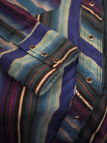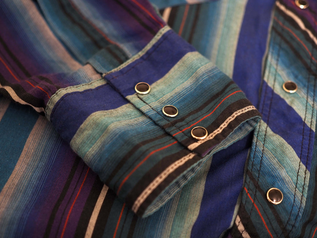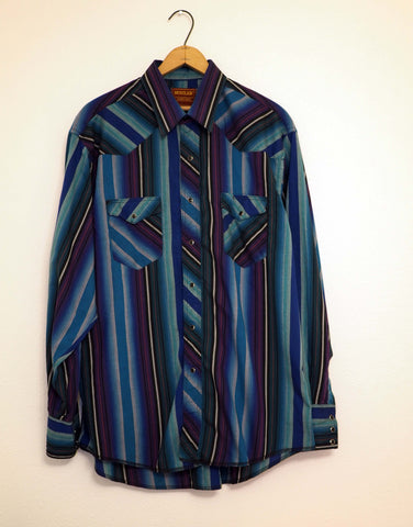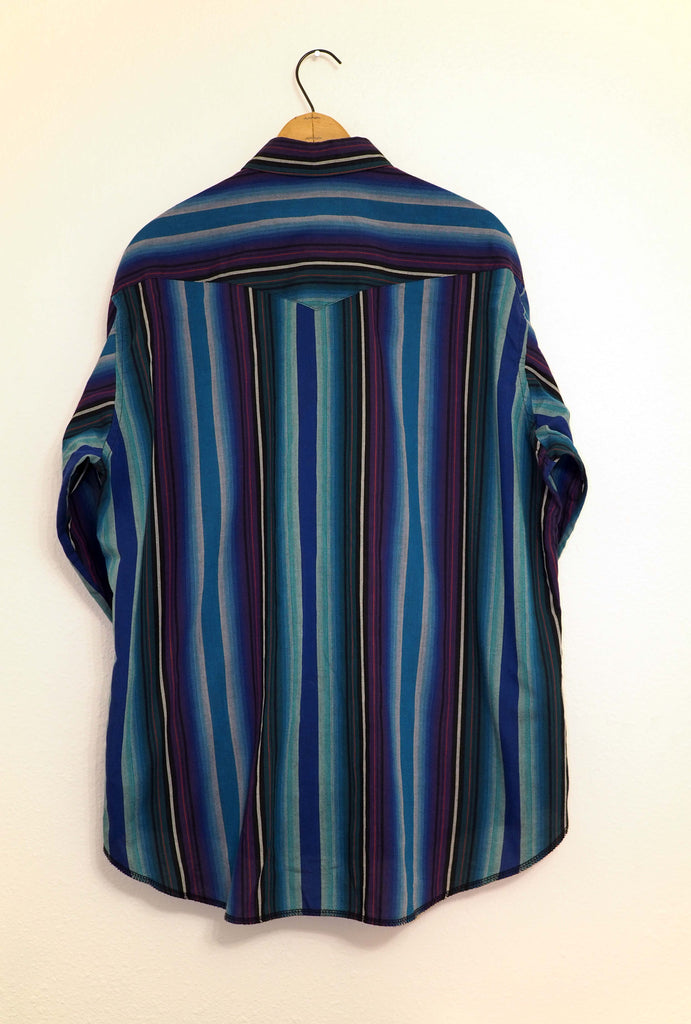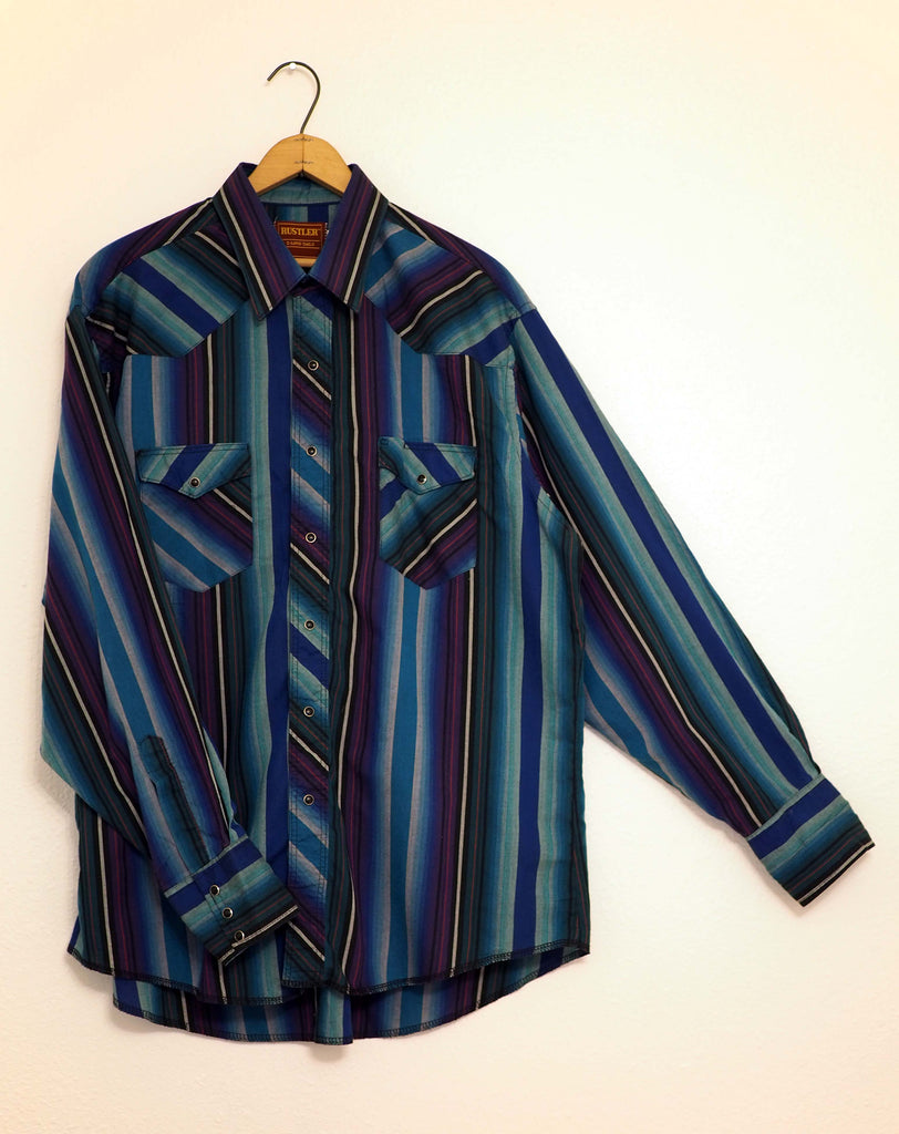 You can’t go wrong with a classic pearl snap! The purple and blue vertical stripes are fun, but not too flashy, and nicely accented with black snaps. Extra long tails ensure your shirt will stay tucked all day. Excellent used condition with no stains or tears. Perfect for everyday work or dressing up.
