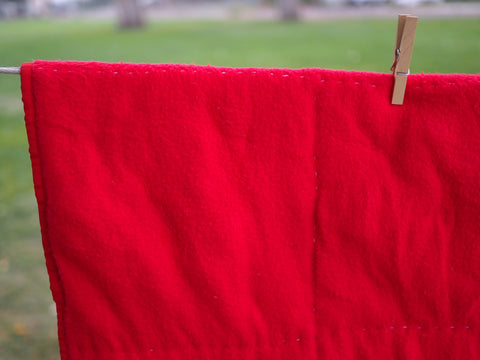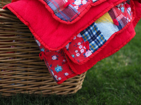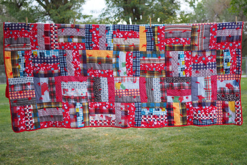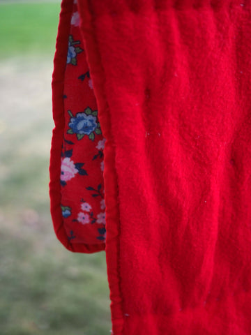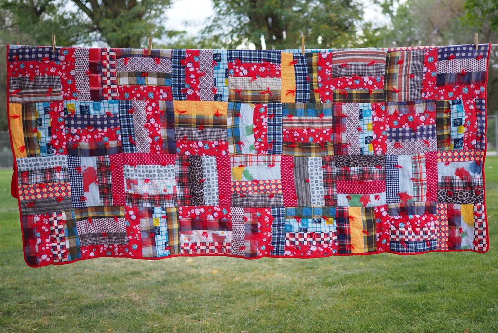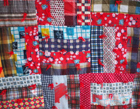 This tied patchwork quilt is so fun and so cozy! Perfect for keeping you warm at night nuzzled up in your bedroll. It has a super-soft red fleece backing. Handmade and in good condition. Large throw blanket size- just a few inches short of fitting a twin sized mattress.